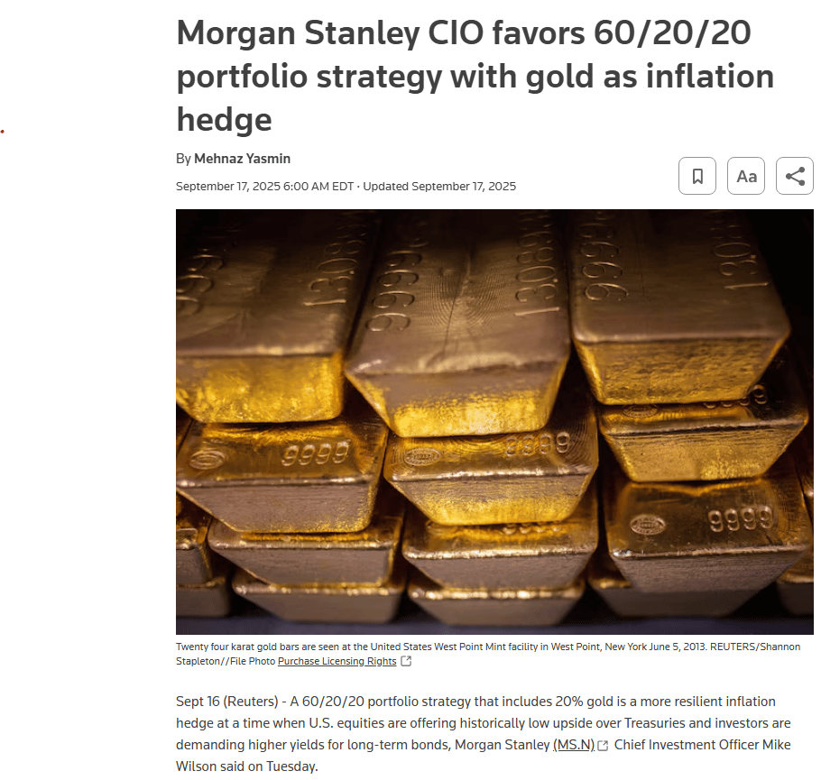 We’re beginning to see institutional players acknowledge precious metals in a way we haven’t in years. Morgan Stanley’s CIO recently highlighted a 60/20/20 portfolio allocation—dedicating 20% to gold—as an inflation hedge and defensive move in today’s market environment. This is a major signal that institutional capital is warming up to metals.