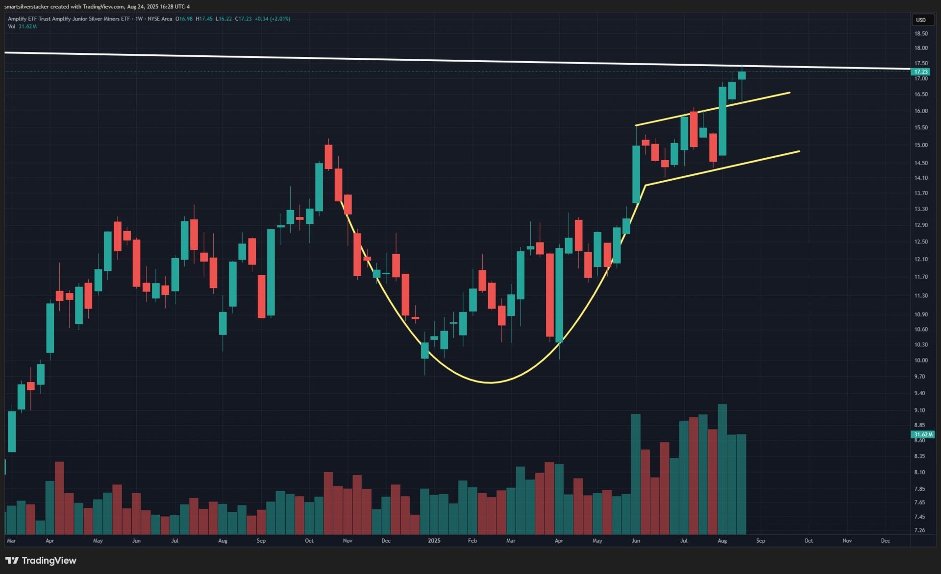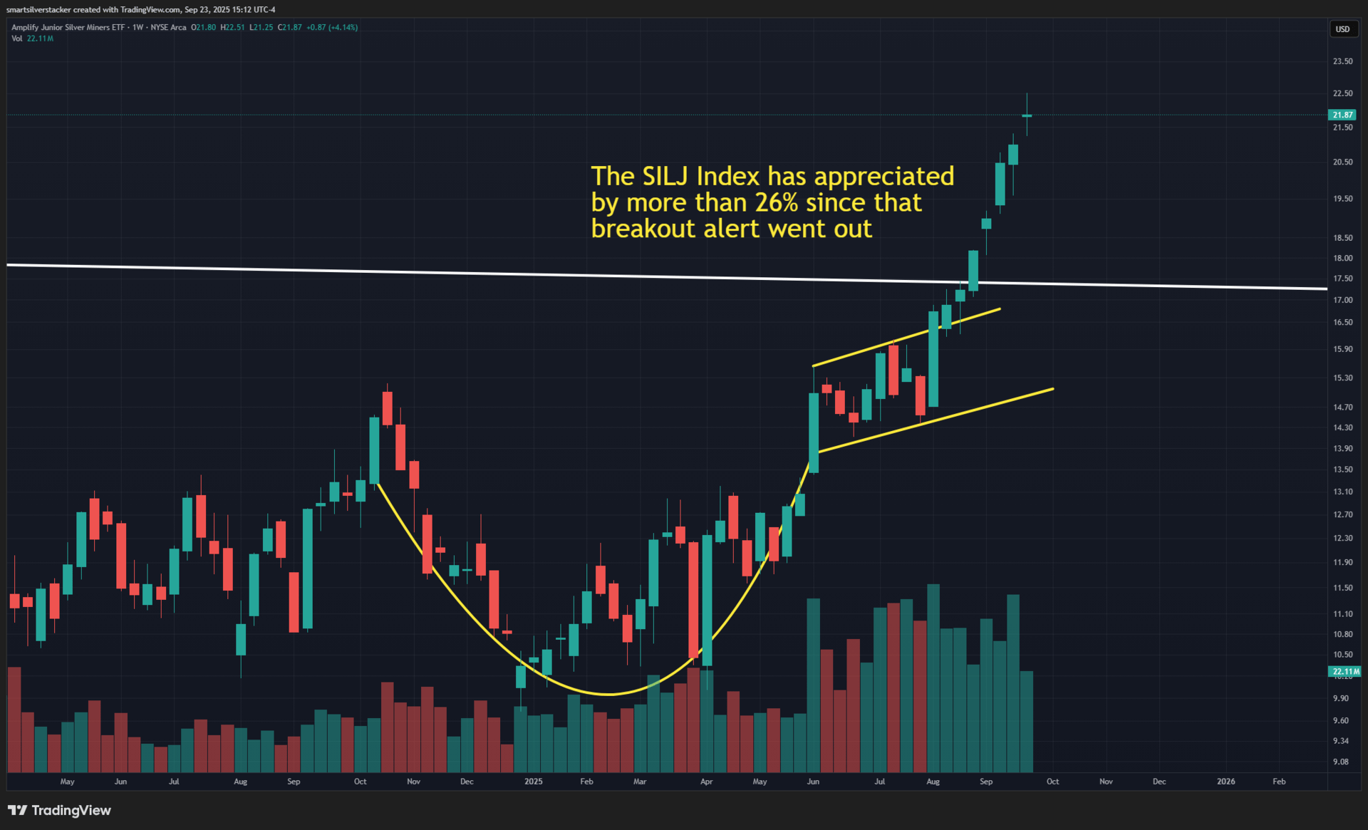 A month ago, I issued a breakout alert on junior silver miners (SILJ). Since that time, SILJ has rallied more than 26%. In this update, you’ll see the original chart alongside the updated version showing just how far this move has gone. If you haven’t yet read that original analysis, you can check it out here: https://smartsilverstacker.beehiiv.com/p/silver-miner-breakout-alert-you-ve-got-to-see-this-chart