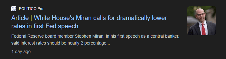 Another critical development: new Federal Reserve board member Stephen Miran—formerly one of President Trump’s chief economic advisers—gave his first Fed speech calling for dramatically lower interest rates. He stated that the federal funds rate should be around 2.5%, significantly lower than current levels. He also warned that current policy risks the Fed’s mandate to maintain full employment.